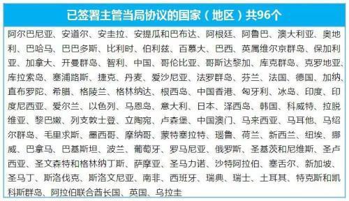 截至20170630,已有96個(gè)國(guó)家(地區(qū))簽署主管當(dāng)局協(xié)議(下圖)。
