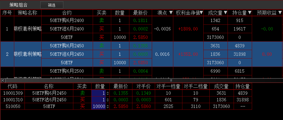 先舉個賣期權(quán)的例子,當(dāng)標(biāo)的跌到2.583時,我判斷50指數(shù)短期要有一波反抽,于是賣出了“50ETF沽6月2550”,由于2.550很接近2.583,這份合約的Gamma和Theta指標(biāo)都很大,所以一旦第二天50指數(shù)真的反抽,我們就可以立刻平倉兌現(xiàn)止盈,這就類似一次短線交易。而如果我賣出的是“50ETF沽6月2400”合約,由于2.400距離2.583還比較遠,所以這份合約只要存續(xù)期間內(nèi)沒有大的風(fēng)險,我們就可以持有到最后一天,這就類似一次中長線交易。