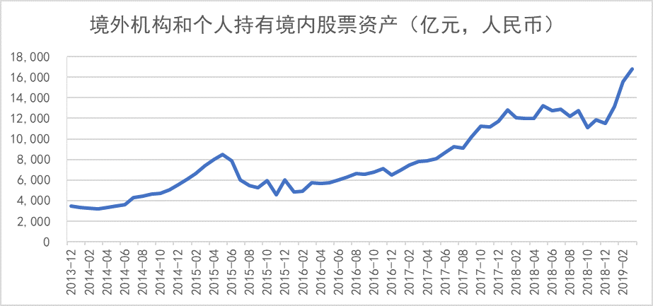 境外機(jī)構(gòu)和個(gè)人持有境內(nèi)股票資產(chǎn)從2014年3月份的3192.87億元提升到2019年3月的16838.88億元,增加了4倍有余。