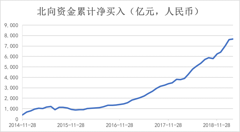 2014年11月17日滬股通開(kāi)通、2016年12月5日深股通開(kāi)通后,北上資金整體呈現(xiàn)不斷上漲的趨勢(shì),到2019年3月份累計(jì)達(dá)到了7672億元。