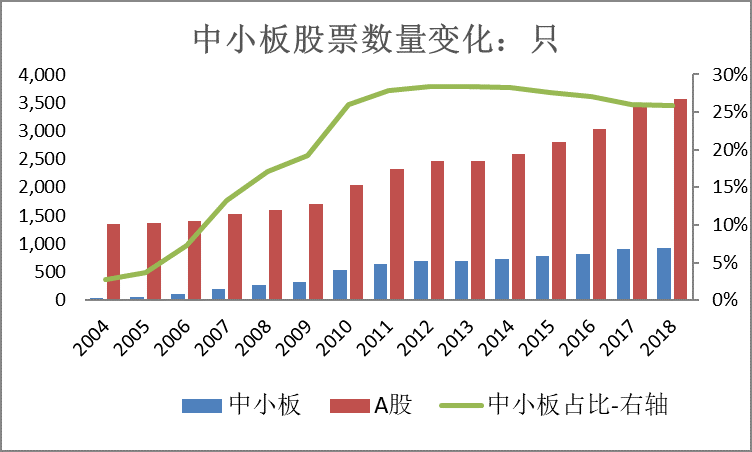 從整體數(shù)量存量上看,A股股票總數(shù)從2004年底的1353只上漲到2018年底的3567只,同期中小板股票數(shù)量從38只上漲到2018年底的922只,短短15年時間,增長了23倍,占A股總數(shù)的比例也從最初的2.81%,上漲到28.4%。