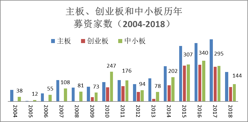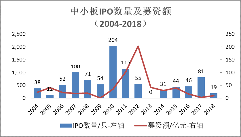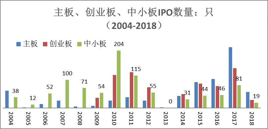 Wind數(shù)據(jù)顯示,2009-2018年主板、創(chuàng)業(yè)板、中小板的年均IPO分別為62、79、70次,而在2013-2018年間,變成86、64、37次,中小板承擔(dān)IPO的次數(shù)在逐步下降。