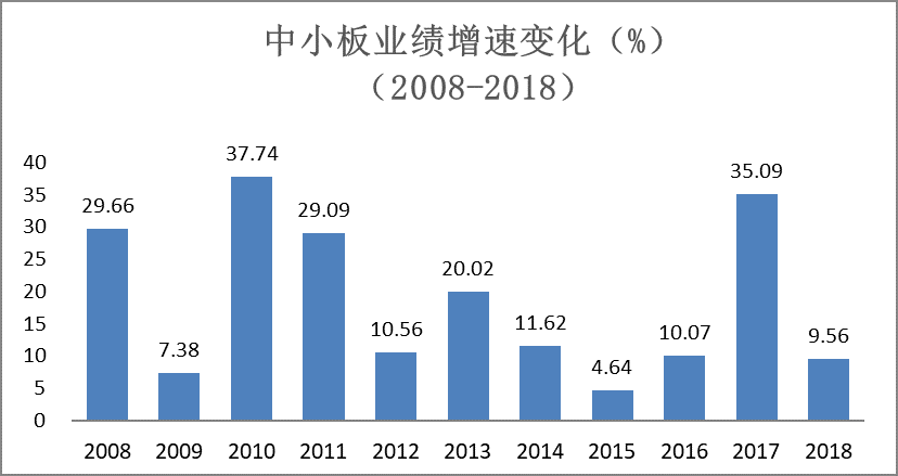 從業(yè)績增長來看,在2008-2018十一年間,業(yè)績增速最高為37.74%,最低為4.46%,8個年頭增速保持2位數(shù),5個年頭增速在20%以上,平均增速水平為18.68%。雖然增速有高有低,但是整體上中小板企業(yè)的業(yè)績保持中高速增長趨勢。