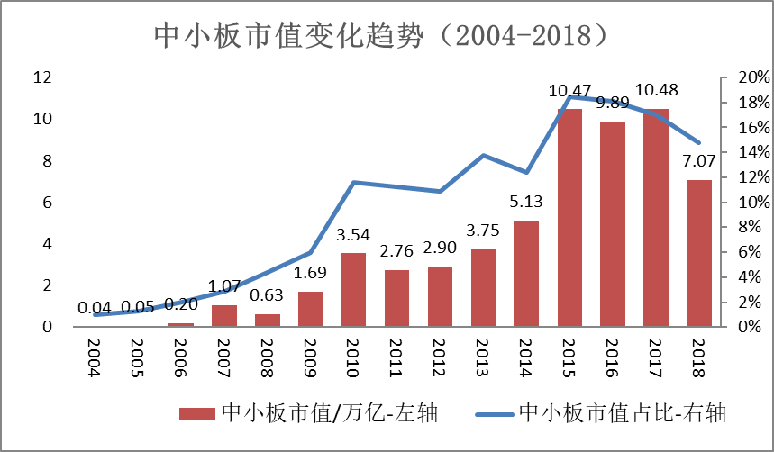 中小板從2004年最低的413億元人民幣增長到最高的2015年的10.48萬億元,整體市值呈現(xiàn)快速增長的趨勢。占A股總市值的比例從最低的0.97%上升到最高的18.45%,但從2015年后呈現(xiàn)下降趨勢。