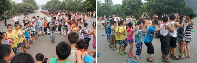 三星堆博物館公園中,孩子們進(jìn)行拓展活動(dòng)。