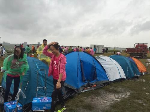 雨一直下。隊(duì)員和志愿者們抵達(dá)臨海的滴水湖畔,將帳篷、桌椅、補(bǔ)給運(yùn)往指定的營地。放眼望去,營地就是一大片泥潭。好吧,深一腳淺一腳地開始支帳篷。
