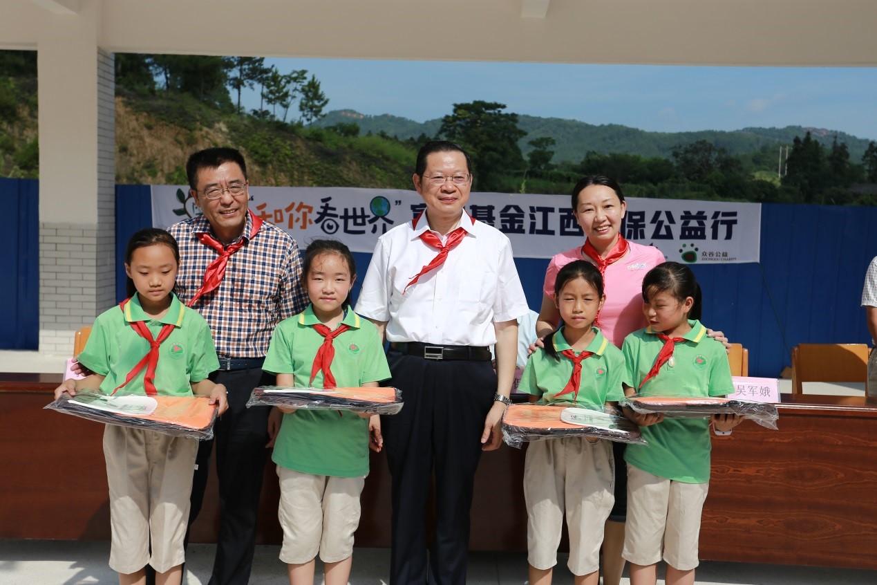 富國基金薛愛東董事長與富國環(huán)保公益基金會領導贈與學生代表書包