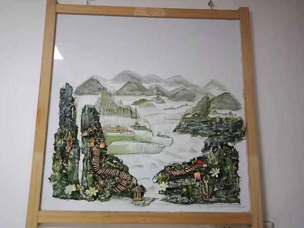 仔細看這幅畫用到的素材不一般,有用過的牙簽、用舊的沙發(fā)套、丟棄的木板、白棉花……一些居民看到后紛紛點贊,沒想到這些廢棄物竟能繪成一幅山清水秀、重巒疊嶂的寫意山水畫。