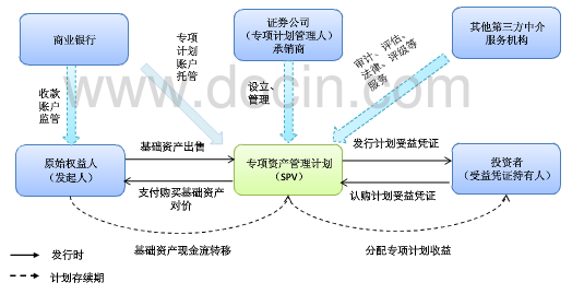 ? 由證券公司或基金管理公司子公司發(fā)起設(shè)立一個(gè)專項(xiàng)資產(chǎn)管理計(jì)劃作為資產(chǎn)證券化的SPV。 專項(xiàng)資產(chǎn)管理計(jì)劃向合格的投資者發(fā)行固定收益類的專項(xiàng)計(jì)劃受益憑證來(lái)募集資金。專項(xiàng)計(jì)劃募集所得資金專項(xiàng)用于購(gòu)買原始權(quán)益人所擁有的特定基礎(chǔ)資產(chǎn)。專項(xiàng)計(jì)劃以基礎(chǔ)資產(chǎn)所產(chǎn)生的現(xiàn)金流入向受益憑證持有人償付本息。